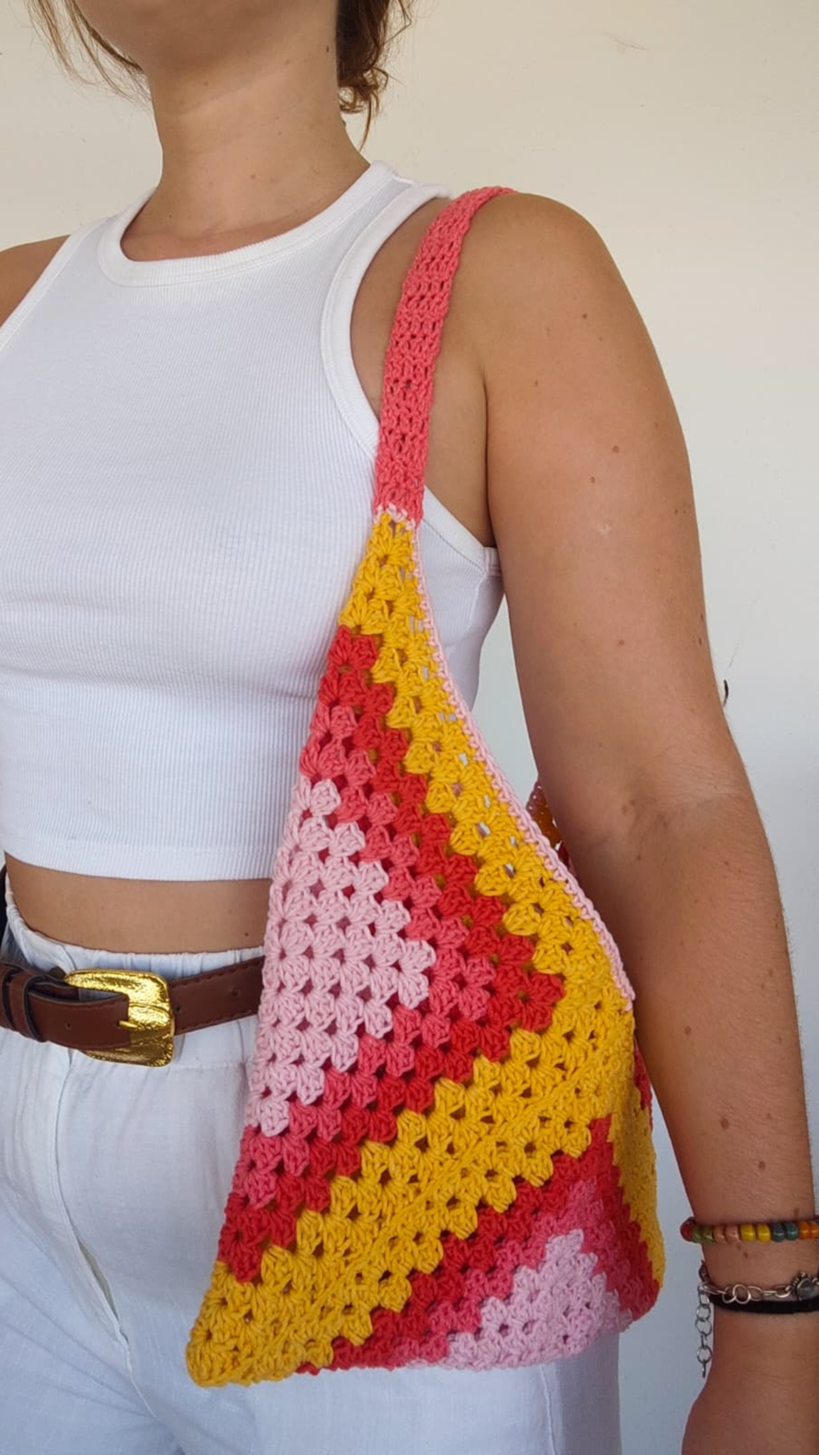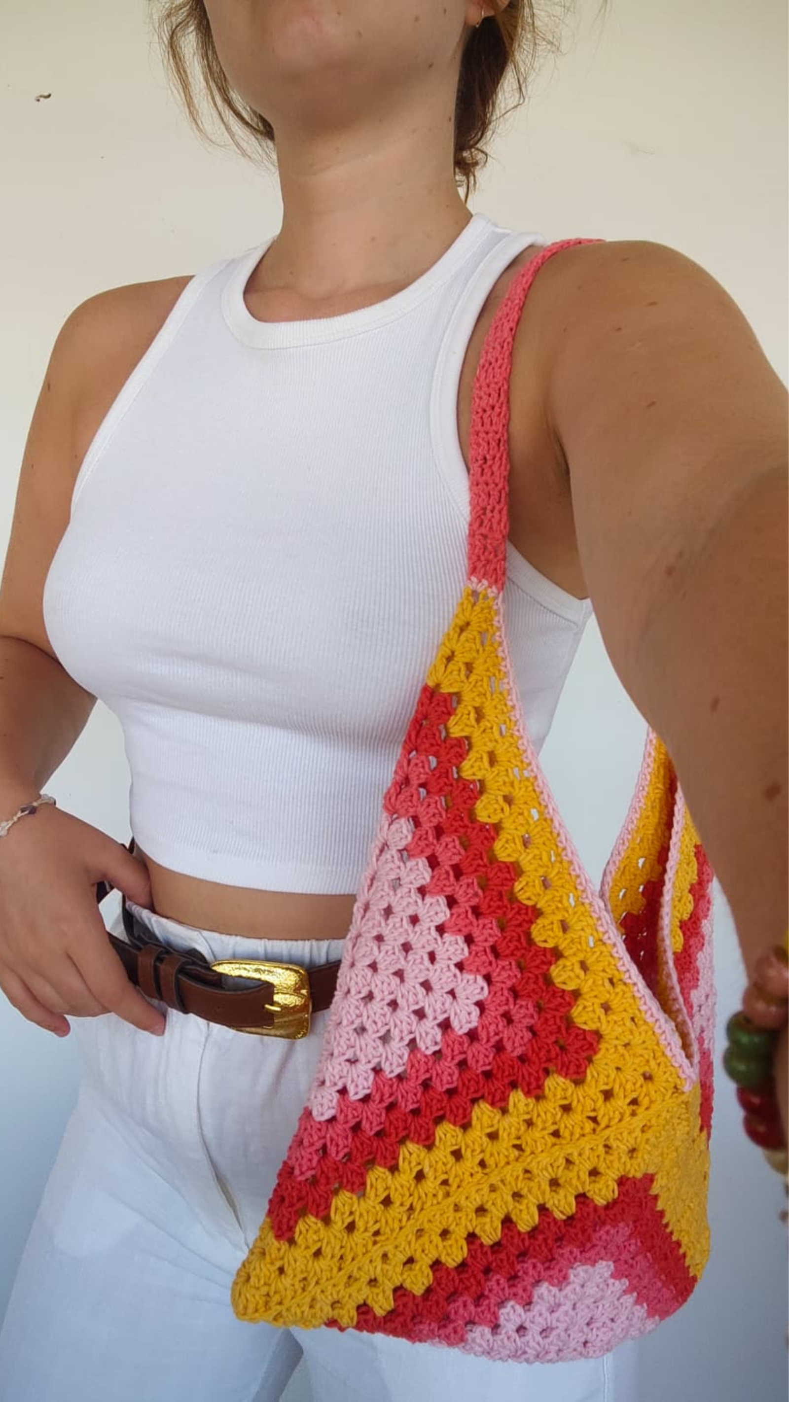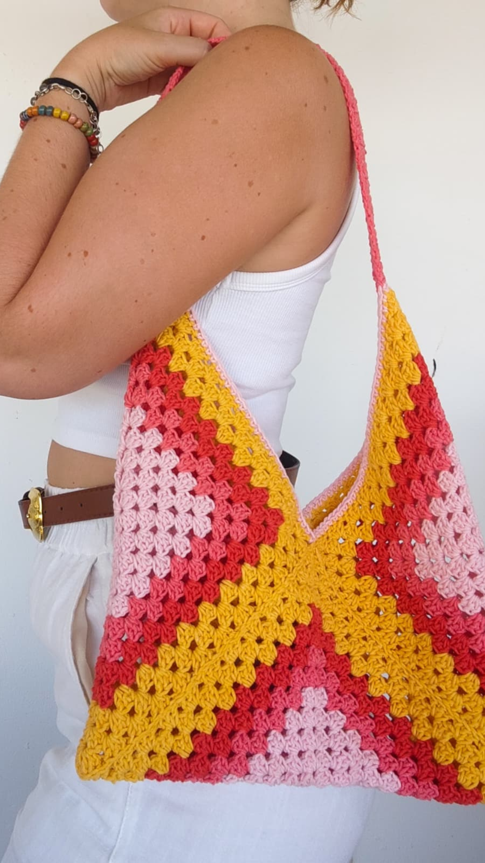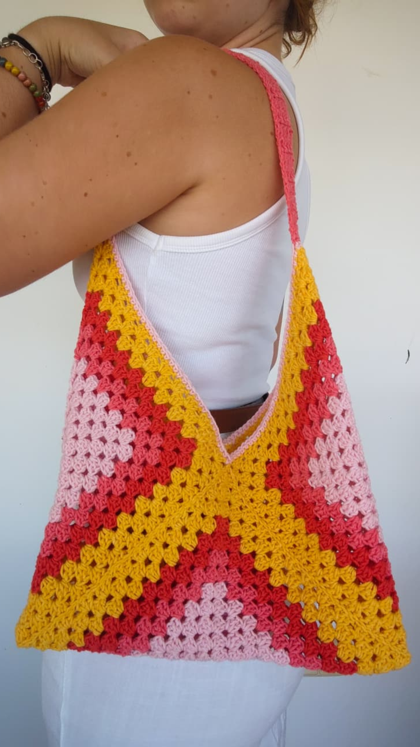 Bolso de algodón realizados a crochet, con la técnica de granny square. Dale color y alegría a tu look. Es el complemento perfecto para tus outfits de verano, paseos al aire libre o días de playa.