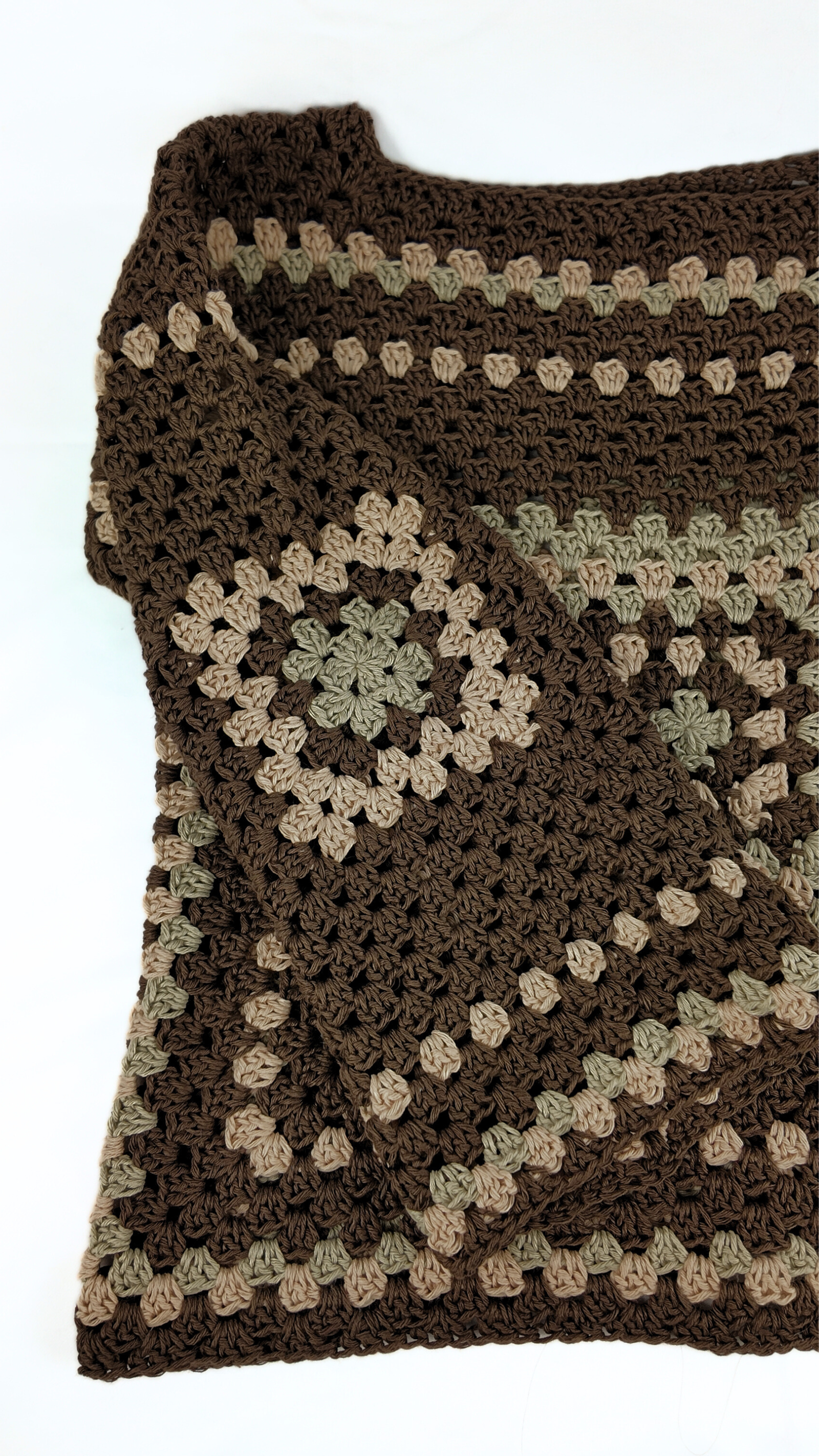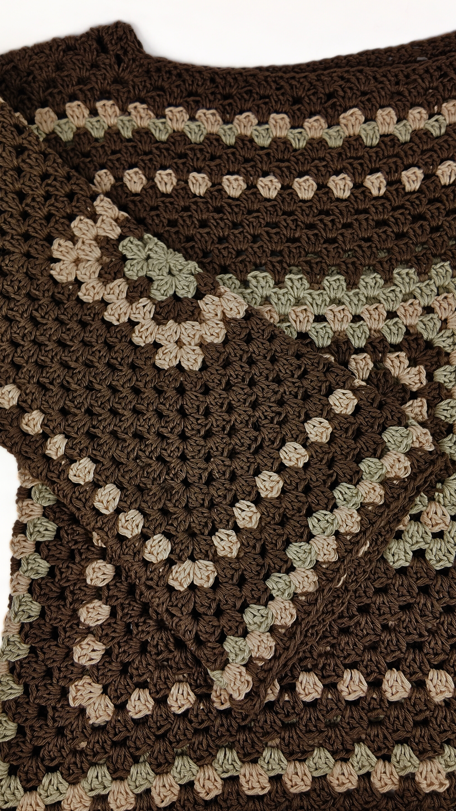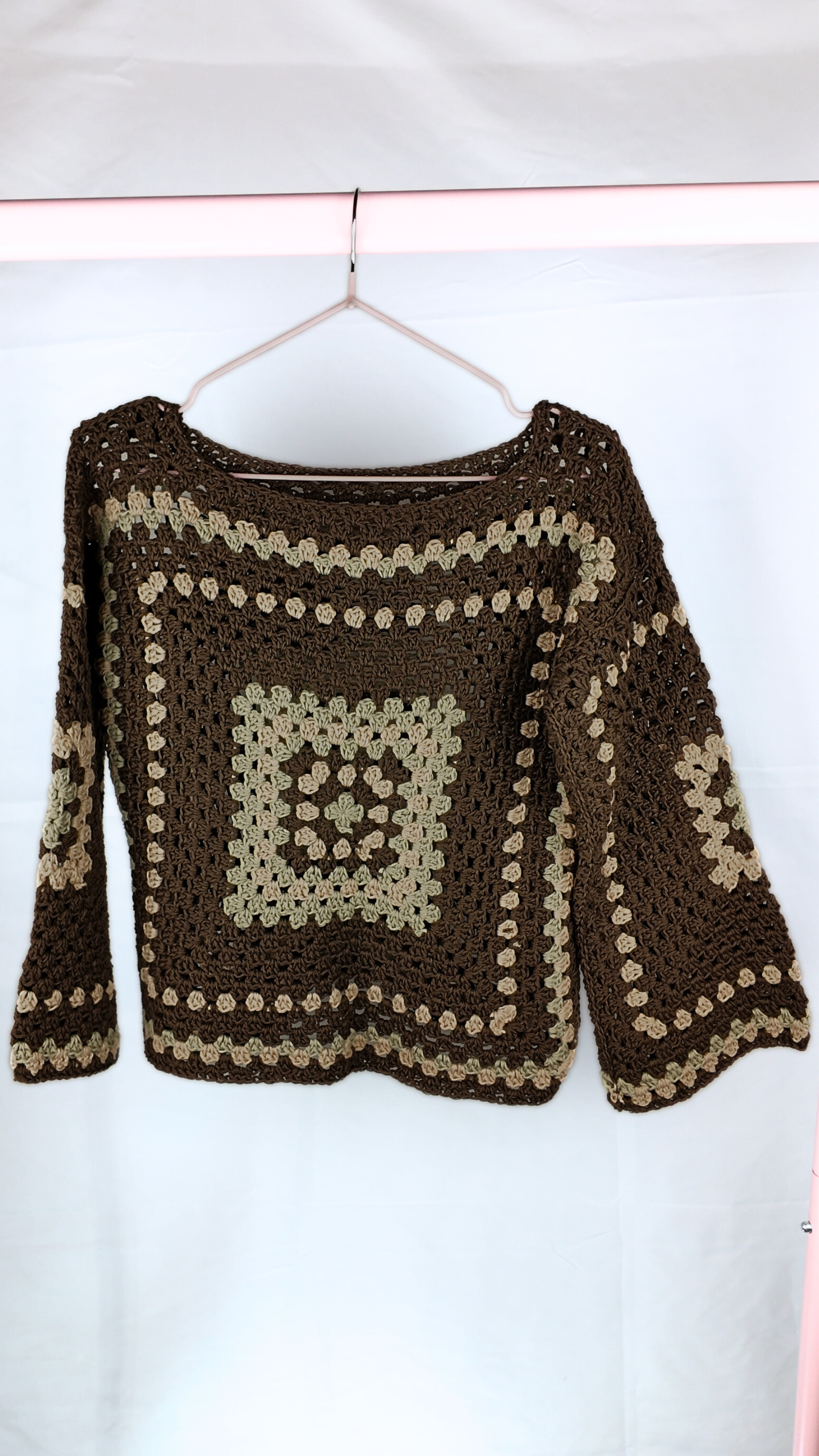 Este hermoso jersey artesanal está tejido a mano con la clásica técnica granny square, fusionando tradición y estilo en una prenda única. Su diseño en tonos marrón, beige y rosa palo, le aporta un aire rústico y acogedor, ideal para los amantes de la moda boho.